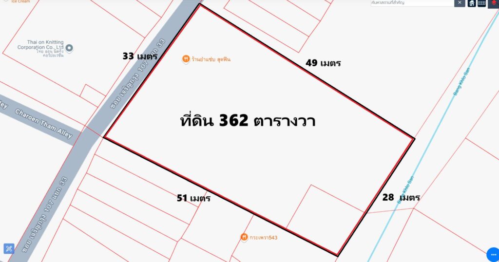 🎯 Vายที่ดินแปลงสวยสี่เหลี่ยมผืนผ้า 362 ตรว. ทำเลใจกลางเมือง ย่านพระราม 3 – เจริญกรุง 107 แยก 33 ตารางวาละ 170,000 บาท รวมราคาทั้งแปลง: 61,540,000 บาท