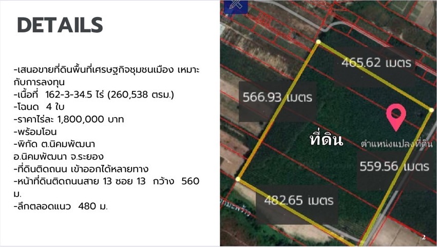 พิกัด ต.มาบข่า อ.นิคมพัฒนา จ.ระยอง – ที่ดินหน้ากว้าง 560 ม ยาว 480 ม.- ตั้งอยู่ในชุมชนเมือง ในเขตเศรษฐกิจพิเศษภาคตะวันออก (EEC)